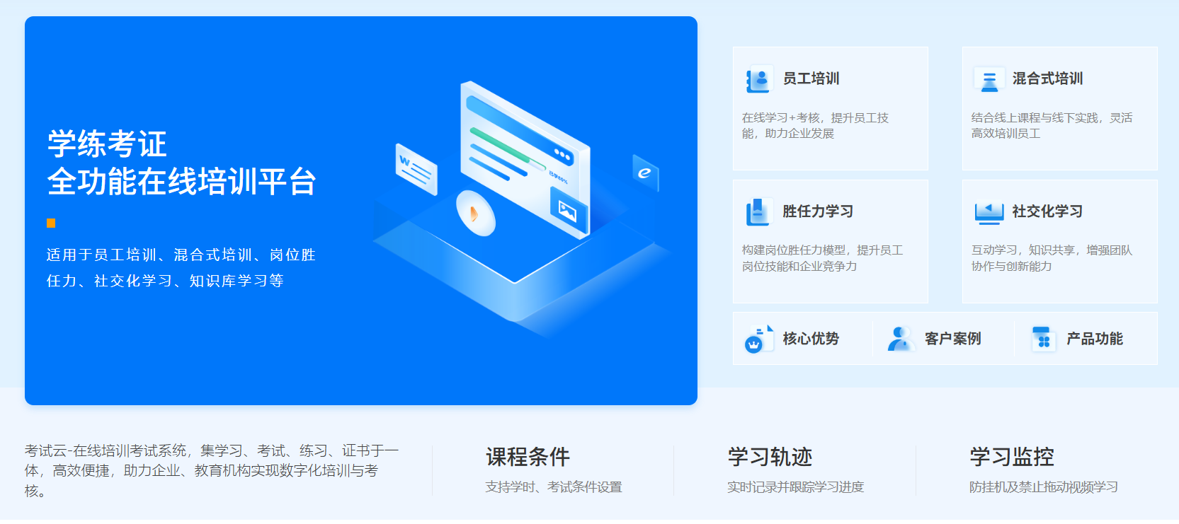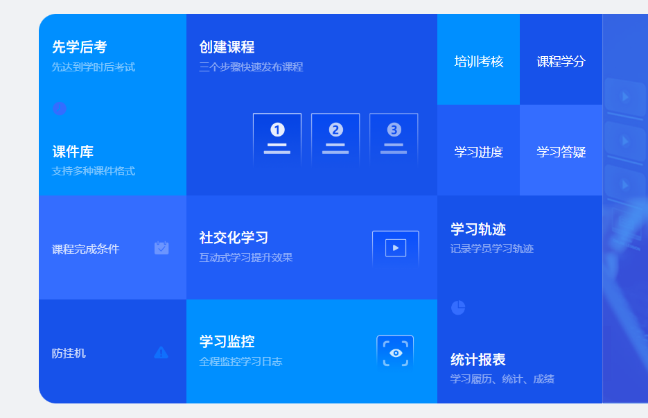 針對上述痛點,考試云創(chuàng)新性地提出“以考促學(xué)、學(xué)考結(jié)合、全程追蹤、數(shù)據(jù)驅(qū)動”的培訓(xùn)理念,打造集課程管理、學(xué)習(xí)過程控制、考試考核、數(shù)據(jù)分析、社交互動于一體的全功能在線學(xué)習(xí)平臺,真正實現(xiàn)從“被動培訓(xùn)”到“主動學(xué)習(xí)”的轉(zhuǎn)變。