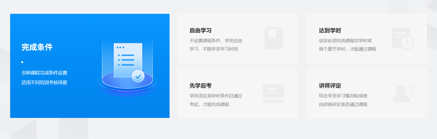 “先學(xué)后考”是考試云的核心機(jī)制。平臺支持設(shè)置嚴(yán)格的課程完成條件,如: