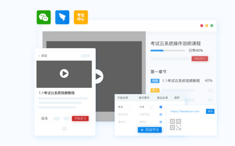 考試云支持PC、手機(jī)、Pad等多終端訪問,學(xué)員可通過微信、APP或瀏覽器隨時進(jìn)入學(xué)習(xí)。獨立的考生中心讓學(xué)員清晰查看待學(xué)課程、學(xué)習(xí)進(jìn)度、考試安排與成績報告,提升學(xué)習(xí)體驗。